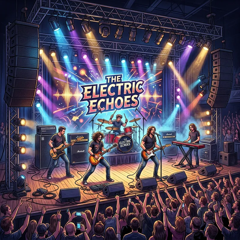 A detailed illustration of a stage setup for a music band.