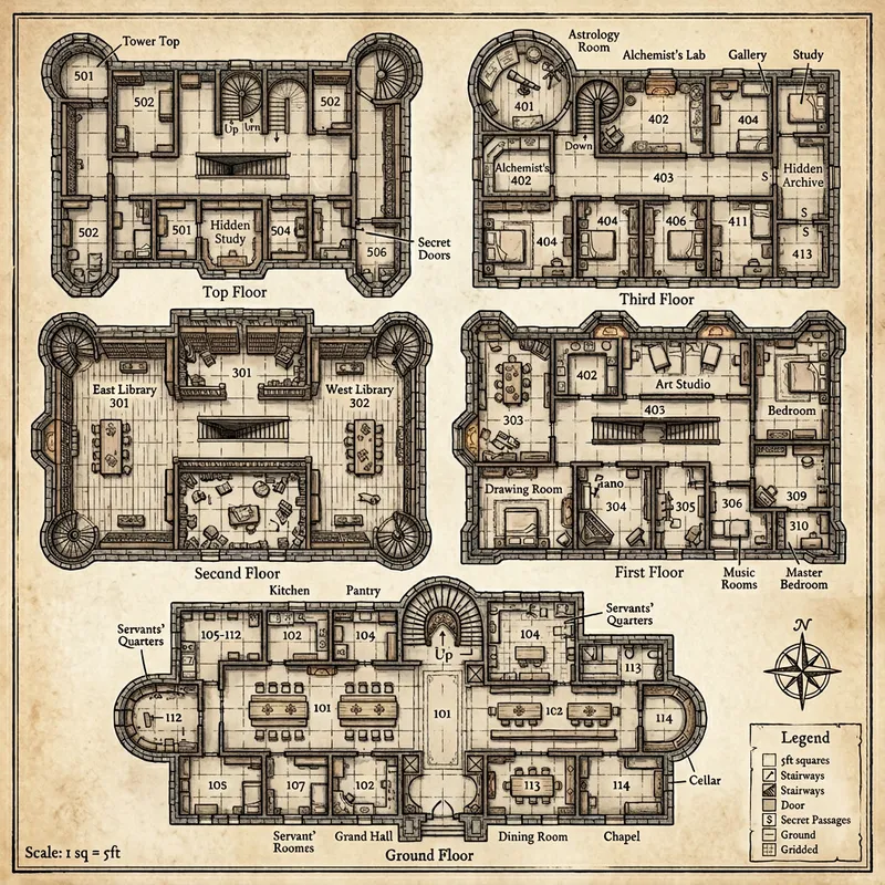 A detailed image of a victorian castle interior, meticulously designed for a Dungeons and Dragons campaign. This castle boasts 50 distinct rooms with 5 floors, each furnished with victorian objects tailored to the period. Features could include stone walls, wooden beams, long, narrow corridors and carved wood staircases. Each room differs in purpose, one could be a grand hall with long wooden tables and ornate chandeliers, two libraries which are both the biggest rooms in the house , brimming with ancient books and scrolls, numerous studies and hidden rooms, bedrooms, music rooms, art rooms, astrology rooms. The map maintains a logical layout to allow players to strategize and navigate efficiently.