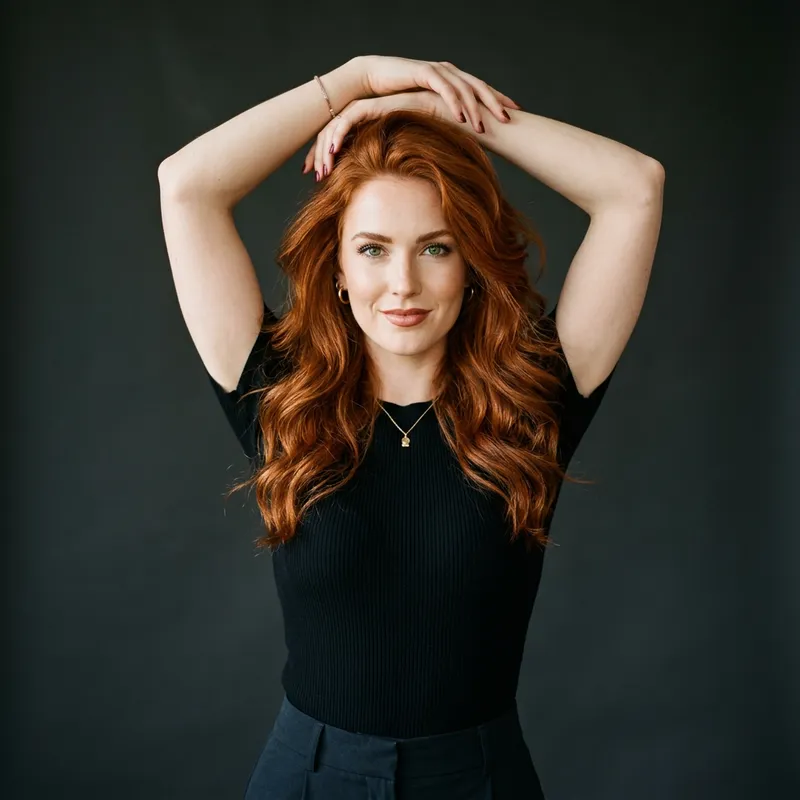 A detailed portrait of a woman with striking red hair, displaying from her waist to her head. Her arms are gracefully raised above her head, defining a strong and empowered posture. She is placed centrally in the frame, contrasting sharply against a plain, undefined background.