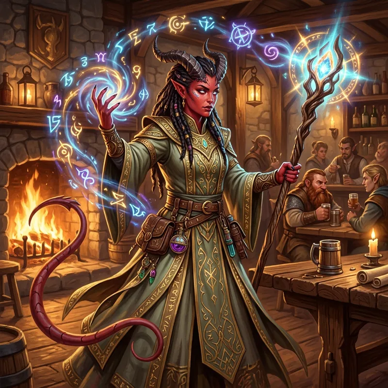A detailed representation of a female spellcasting character, identifiable as a sorcerer. The character possesses distinguishing traits typically associated with tieflings in fantasy literature, such as pointy horns sweeping backwards from their forehead, a long slender tail, and vibrant red skin. They wear an elaborate wardrobe, befitting of their arcane profession, including sage green and muted gold robes adorned with symbols of ancient magic. They're handling a mystical staff glowing with an otherworldly light. Around them floats several arcane symbols signifying their spellcasting prowess. The background setting would be a cosy tavern lit bit firelight.
