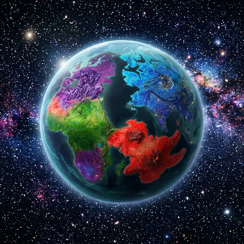 A digitally rendered, exotic planet against a nightly background. The sphere contains boldly colorful continents that stand out with vibrant shades of red, blue, green, and purple. Intricate detailing shows the topographical variety on the planet surfaces. around the spherical planet there is a transparent atmospheric envelope.