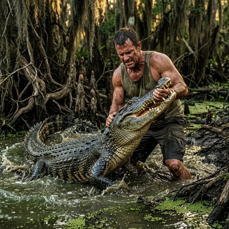 A dramatic and intense scene depicting a fierce battle between a large, scaly crocodile and a strong, muscular human, both engaged in a fierce and desperate struggle, their bodies entwined as they clash in a murky, swampy environment, the air thick with tension and sweat, the human's facial features contorted in a mix of fear and determination, with beads of sweat dripping down their forehead, and the crocodile's jaws wide open, revealing sharp, pointed teeth, its scaly skin glistening with moisture, the human's hands grasping the crocodile's snout, trying to pry it open, as the battle rages on, with green murky waters and twisted tree roots surrounding them, illuminated by a warm, golden light, casting long shadows across the scene.