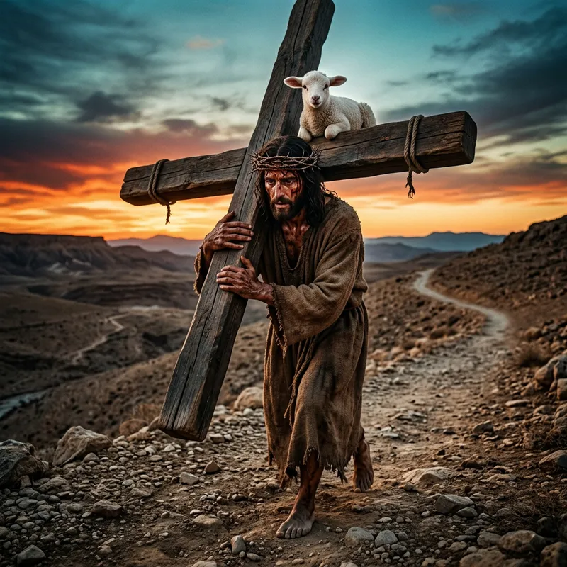 A dramatic and symbolic depiction of Jesus Christ carrying a heavy wooden cross, wearing a crown of thorns. His face shows intense suffering and determination. Perched calmly on the top beam of the cross is a young, white lamb, looking forward. The scene is set in a barren, rocky landscape with a gradient sky at sunset, transitioning from warm orange and red hues to cool blues and teals. The ground is textured with pebbles and sand. The overall style is photorealistic with a strong emotional impact.