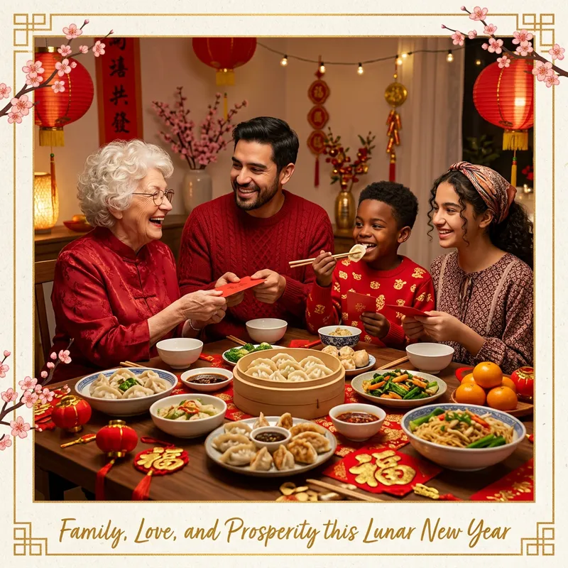 Create a heartfelt Lunar New Year card depicting a diverse family gathering around a dinner table. The family includes an elderly Caucasian grandmother, a young Hispanic father, an energetic Black boy, and a Middle-Eastern teenage girl. They are indulging in a flavorful feast of dumplings, their faces lit up with the warm joy the occasion brings. Red envelopes can be seen being exchanged among them, symbolizing wishes of good fortune. Add an inscription at the bottom that reads: 'Family, Love, and Prosperity this Lunar New Year', written in a tender and warm script font.