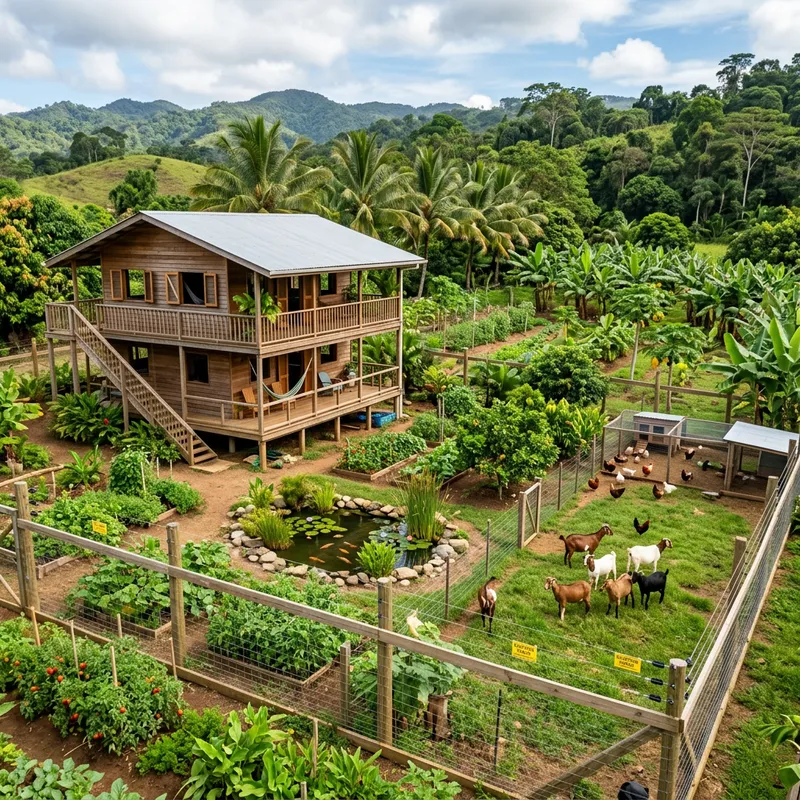 A farm in tropical regions. The farm is about 3 acres with fence and electric fence. A two-storey simple cabin house. Have balcony. Simple design, more air inside. Have a few livestock. Chicken, goat. Polyculture farming. Have small pool with fish.