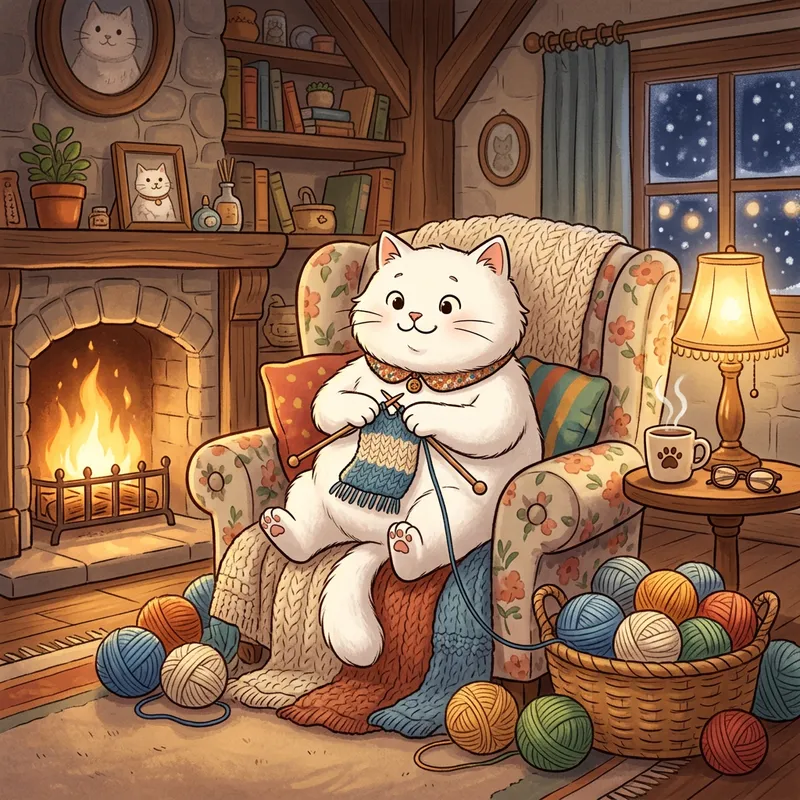 A fat white cat knitting with her hands, cozy atmosphere, sitting on a comfortable chair, surrounded by yarn balls, warm lighting, whimsical and cartoonish style.