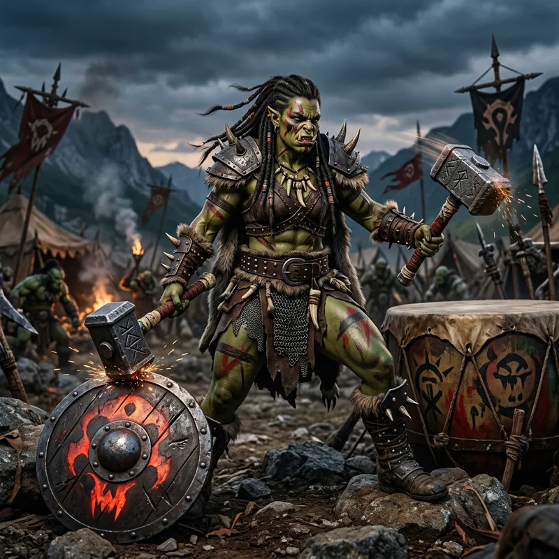 A female orc barbarian, with two warhammers in her hand. She stands battle ready, while drumming a drumming a rhythm with her hammers.