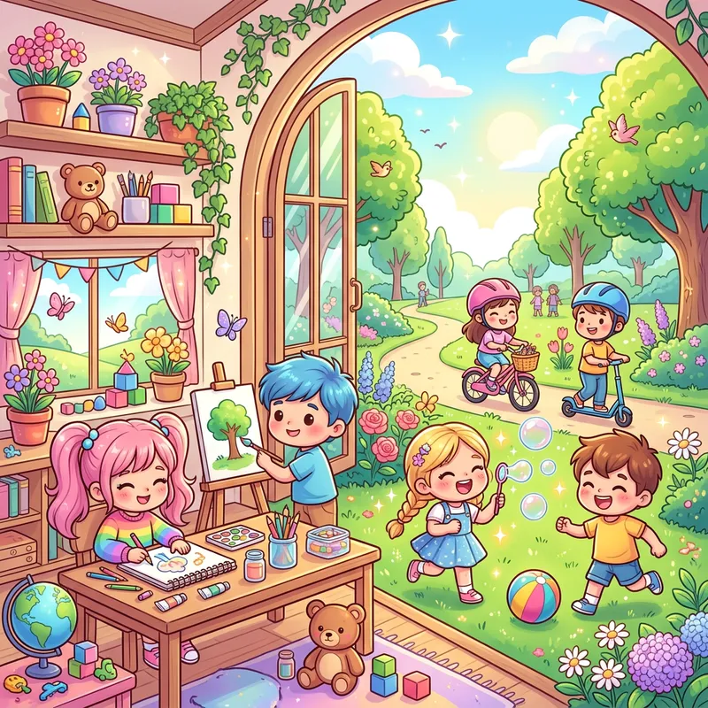 A full-page vertical illustration for a children's coloring book cover showing cute chibi kids enjoying fun hobbies both indoors and outdoors — some children painting or drawing near a big open window, while others play with a ball, ride bikes, or blow bubbles outside in a sunny park. The scene is colorful, lively, and balanced between cozy interior elements (desk, toys, art supplies) and bright outdoor scenery (trees, flowers, blue sky). Kawaii chibi style with vivid, saturated colors (pinks, blues, yellows, greens), soft gradients, warm lighting, sparkles, and light bokeh for a magical, joyful atmosphere. No text, no borders, perfect for children ages 5 and up.