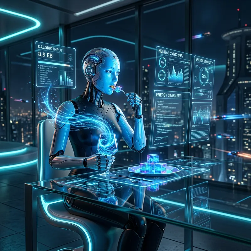 A futuristic AI being seated at a hyper-modern glass dining table, consuming holographic energy cubes and a synthetic neural drink made of pure data streams. The environment is sleek and futuristic, with holographic interface panels floating around, analyzing the AI’s digital meal. The color palette is clean and high-tech, with soft neon blue and silver reflections. Ultra-detailed lighting and cinematic atmosphere.