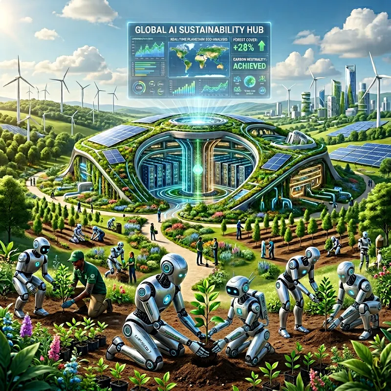 Imagine a futuristic depiction of our world where artificial intelligence plays a central role in environmental sustainability. Visualize massive green, eco-friendly data centers, pulsating with the glowing, soft light of innumerable artificial intelligence units. Picture these AI units engaged in analyzing, processing, and managing environmental data for optimum resource utilization. Witness autonomous robots, of varying descent and gender equivalent, actively planting trees, their metallic bodies glinting in the sun as they labor lovingly over each sapling. Interwoven within the scene, observe prominent symbols of renewable energy, like wind turbines and solar panels, signifying the AI's commitment to sustainable energy practices.