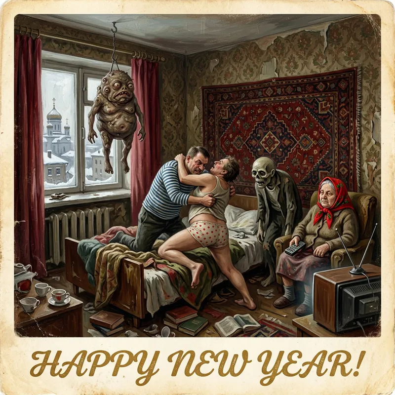 A grotesque surreal oil painting, depicted as a vintage-style greeting card. The disturbing scene is set within a cluttered Soviet-era bedroom. Key elements include: a monster hanging from the ceiling near a window with heavy red curtains. In the center, two people are struggling: one in a striped shirt, and the other wearing underwear with a red polka dot print. A hunched, skull-faced creature is nearby, and an old woman in a red headscarf looks on with a remote control. The walls have patterned wallpaper, a traditional Persian rug hangs prominently, and a vintage TV with rabbit ears is in the corner. Snow outside the window, with a visible domed church. The mood is unsettling, darkly humorous, and absurd, characteristic of post-Soviet surrealism. At the bottom of the image, in vintage style golden letters, the text 'HAPPY NEW YEAR!' is prominently displayed.