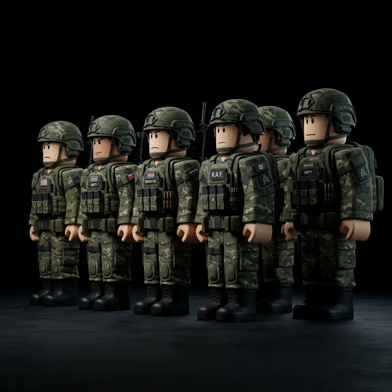 A group of characters styled like Roblox avatars, dressed in military uniforms, standing at attention and looking towards the left side of the image. They are situated against a stark, black background, adding a sense of intensity and drama to the scene.