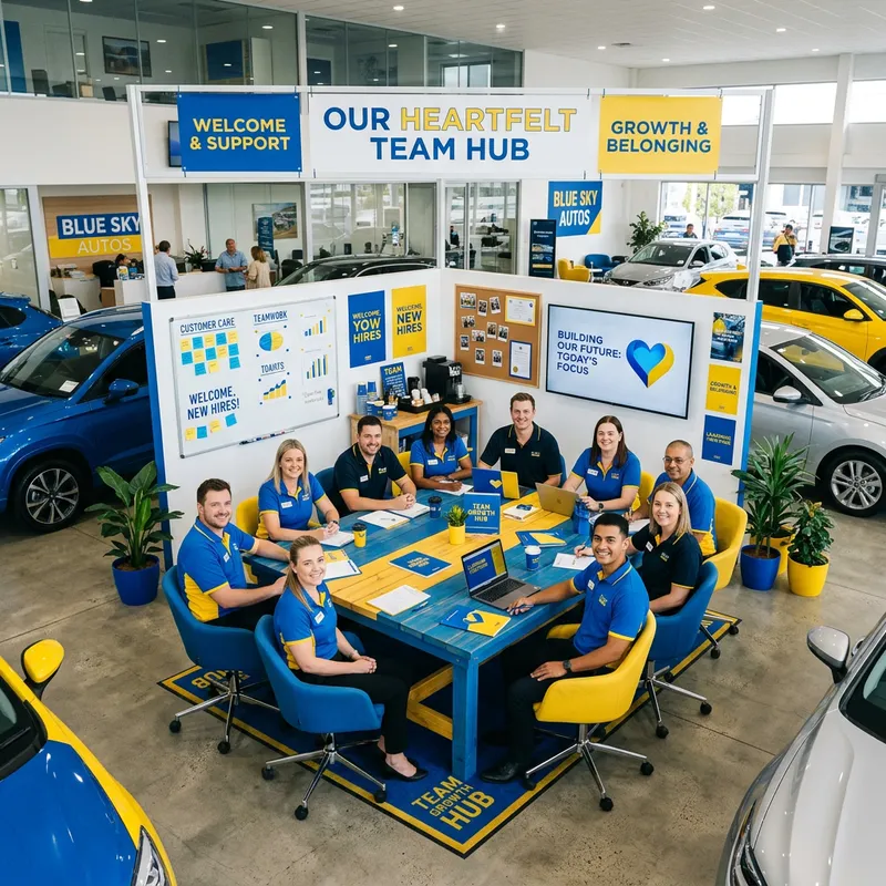 a heart felt training environment located in the middle of a car dealership. It should be blue and yellow. no red
