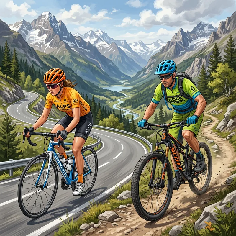 a high quality illustration of a person riding a mountain bike and another on a road bike both wearing helmets and bright clothes with mountains and roads in the background realistic style.