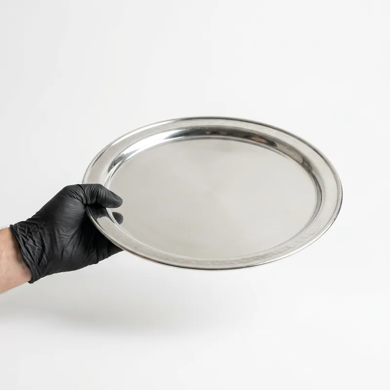 A high-resolution photo of a human hand wearing a black nitrile glove, holding a large silver serving tray in front of a bright, seamless white background. The tray is seen from the side, angled slightly up, like it’s being presented. Soft natural shadows fall behind the tray and hand. The center of the tray is empty with clean lighting and mild reflection, prepared to overlay a food item in post-production. Styled for realistic food photography, minimalism, and editorial-style lighting. Shot with a DSLR, 85mm lens, f/2.8, ISO 100 –– photorealistic, no text, no food.