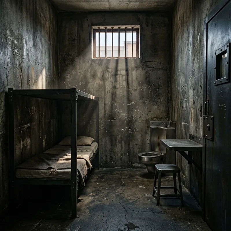 A highly detailed depiction of a solitary confinement prison cell. It is roughly 6 x 9 feet in size with a small barred window high up on one wall, allowing a sliver of sunlight to beam inside. The walls are weathered and discolored, an ode to the passage of time and the many who may have inhabited it. There's a simple bunk bed made out of plain metal with a thin mattress, and a tiny table with a lone chair. Lastly, a minimalistic stainless steel combination of sink and toilet is pushed towards one corner of the cell. The atmosphere is intense yet silent; capturing the essence of isolation and loneliness that such an environment embodies.