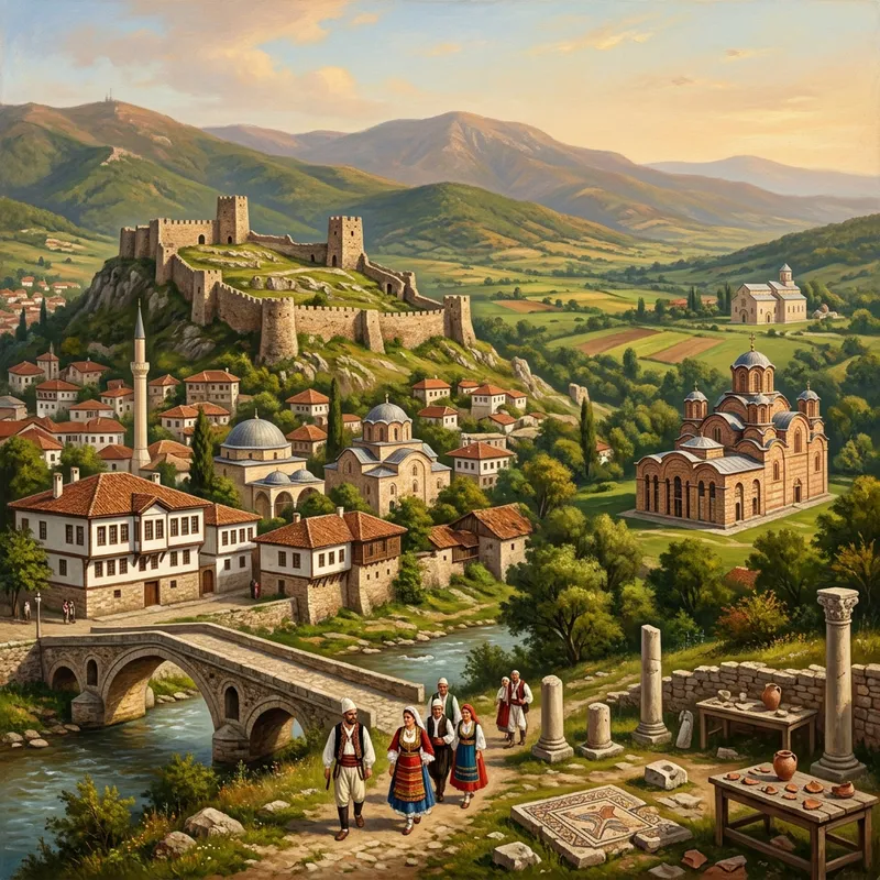 A historical scene depicting the rich history of Kosovo, illustrating significant cultural and historical elements such as traditional architecture, medieval castles, ancient artifacts, and landscapes that reflect its diverse heritage.