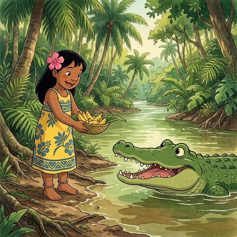 Giant Green Kawaii Crocodile Meets Tahitian Girl