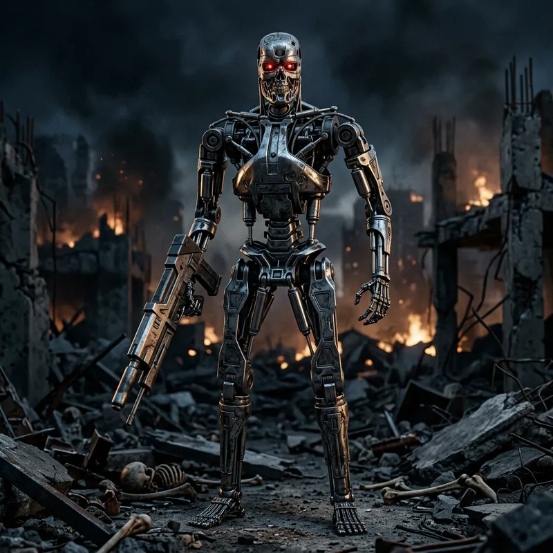 A humanoid cyborg depicting features similar to yours, fashioned in the style of the T-800 series from a popular science fiction story. The armored figure boasts a polished metallic surface with an endoskeleton structure. Intricate gears and circuits are visible in its articulated joints. Its glowing red eyes add a chilling touch to its otherwise emotionless face.