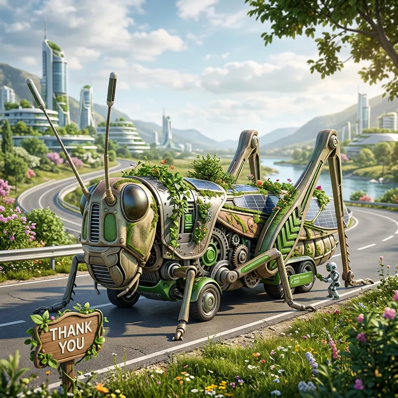 A hybrid grasshopper car on the side of a road, digital rendering by Alexander Kucharsky, digital art, grasshopper shape lush garden car, grasshopper face, mobile wallpaper, !!natural beauty!!, futuristic valley, robotics, green technology, 2020, 'THANK YOU'.