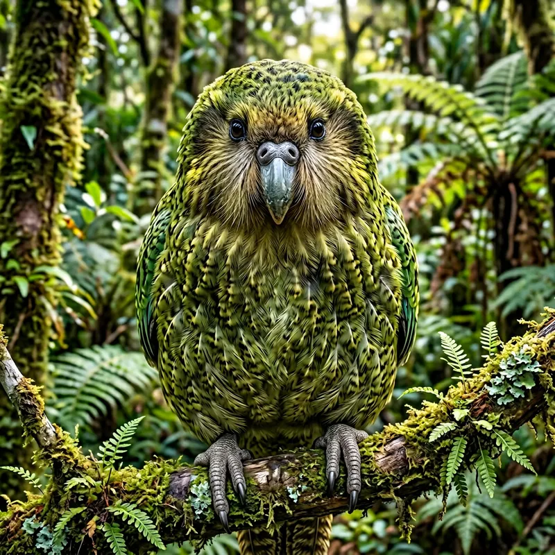 A hyper-realistic illustration of a Kakapo (a large, flightless parrot) in a front-facing pose, perched on a detailed tree branch in a natural New Zealand forest setting. The Kakapo has lifelike green feathers with intricate detailing, showing the texture and subtle yellow and blue highlights under natural lighting. Its large, expressive eyes and textured beak are rendered with realistic detail. The background features a lush, realistic forest with ferns and moss-covered trees, softly blurred to maintain focus on the bird. The overall atmosphere conveys the serenity and beauty of the Kakapo's natural habitat.
