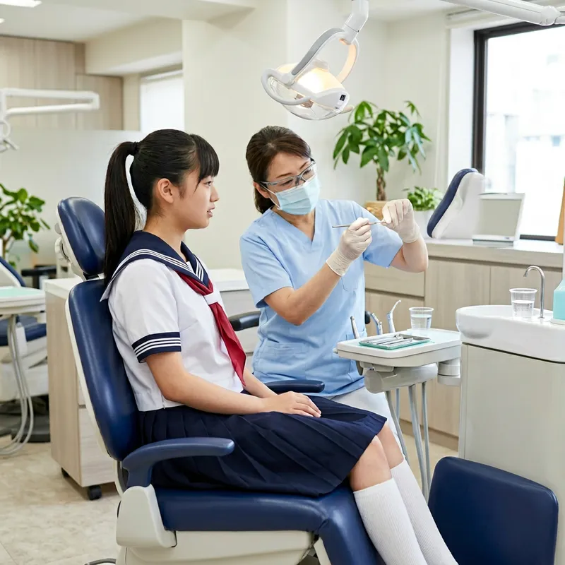 A Japanese schoolgirl, with her hair tied back in a ponytail, wearing a white sailor suit uniform and a navy blue pleated skirt, sitting in an upright position in a dentist's chair. Her mouth is open as a dentist, wearing medical scrubs and gloves, prepares to perform a routine dental check-up.