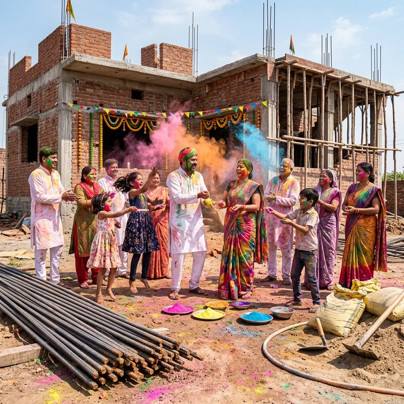 A joyous Indian family celebrating Holi outside their home under construction. Bright colors of gulal fill the air as men, women, and children in traditional Indian attire laugh and throw colors at each other. In the foreground, a pile of strong TMT bars is placed on the ground, symbolizing the foundation of their dream home. The festive atmosphere is enhanced by hanging colorful decorations, scattered plates of vibrant powdered colors, and the rustic charm of an unfinished brick house. The scene is lively, warm, and full of happiness, capturing the spirit of togetherness and future aspirations.
