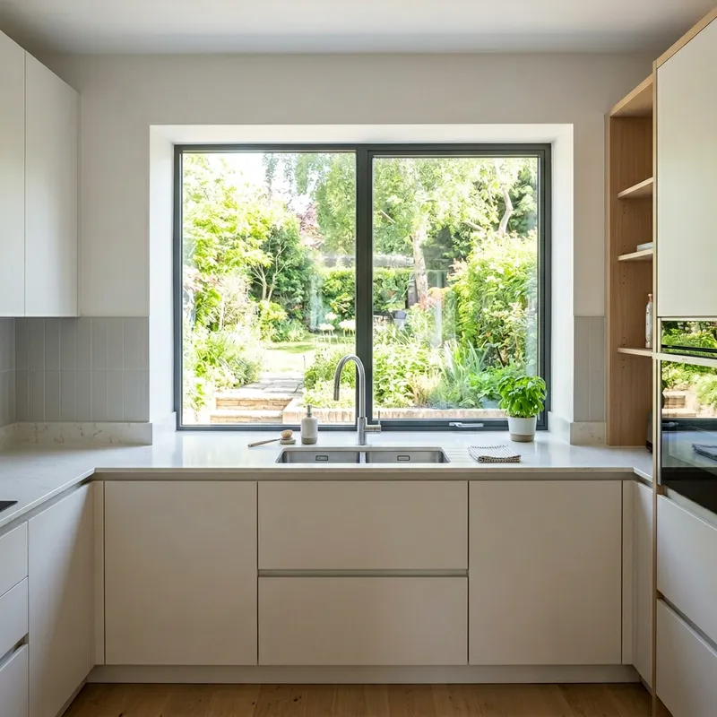 Modern Kitchen Design: Large Window and Sleek Finishes