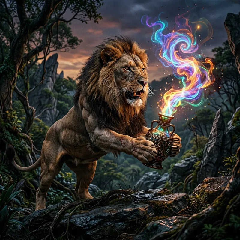 The Wild Majesty of a Lion with a Chemical Vase