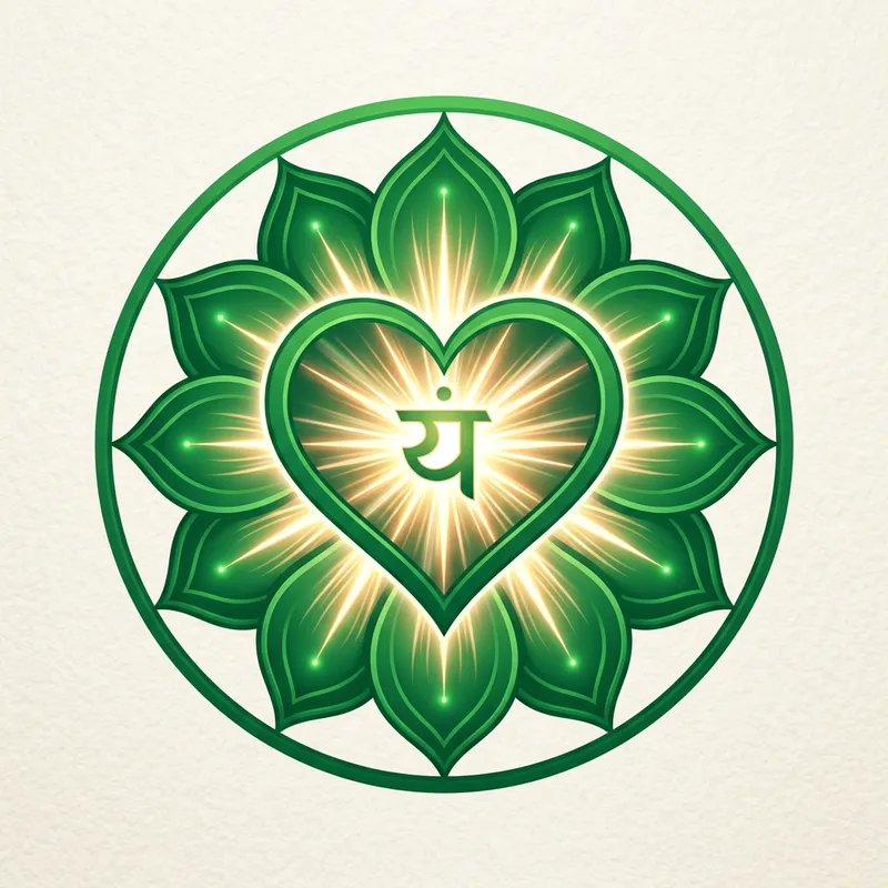 A logo of the anahata chakra in green containing a heart symbol in the center and inside the heart rays of light are emerging