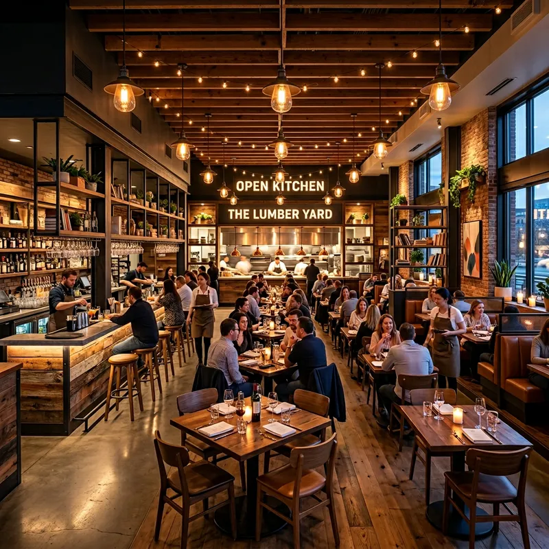 A long panoramic photo of a modern restaurant interior with warm lighting, wooden tables and chairs, vibrant atmosphere, high-resolution, photorealistic.