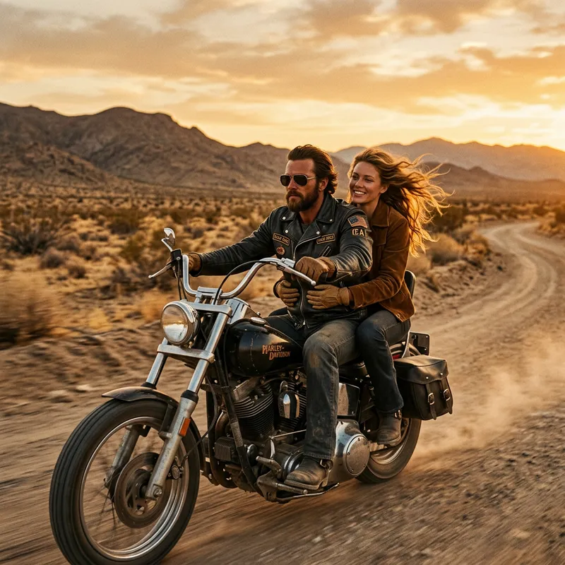 A male biker in a black leather jacket and sunglasses is riding a vintage Harley-Davidson on a dusty desert road. A female passenger sits behind him, holding his waist, her hair blowing in the wind. The man grips the handlebars firmly, focused on the road ahead. The setting sun casts a golden glow, creating a cinematic 1970s film look with warm tones and slight film grain. The background features an open highway, dry desert landscape, and a few distant mountains.