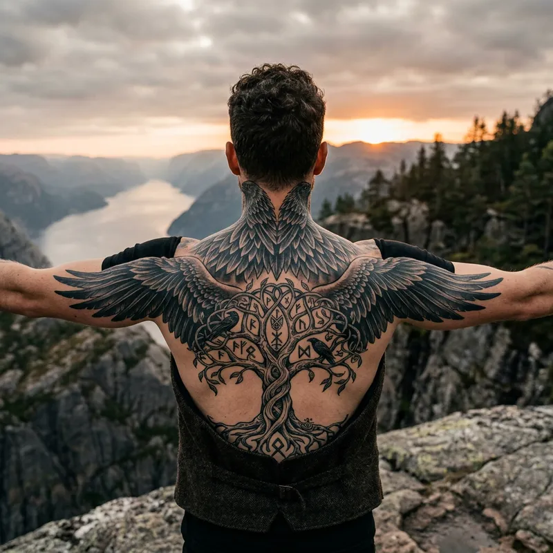 A man seen from the back, with his arms extended sideways. He has a tattoo of raven feathers covering his entire neck, nape, and shoulders, that transitions into wings on his back. Between the wings, there is a depiction of Yggdrasil, the mythical Nordic tree of life.