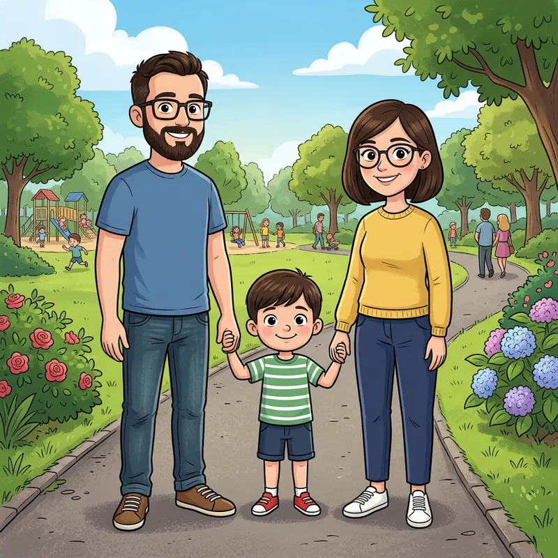 a man (white, dark short hair with beard and square black framed glasses and 175cm tall), a woman (white, straight dark bob haircut with no bangs with round black frame glasses) and a boy (4 years old, white, short straight dark hair) standing together. make it into a cartoon style drawing, full body showing.