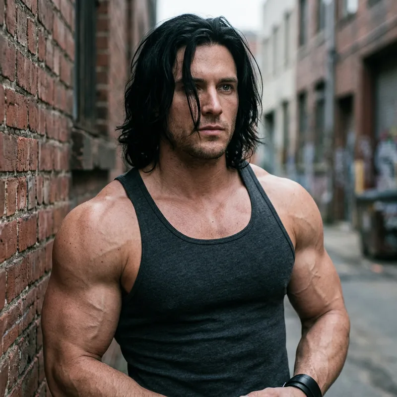 A man with solid, sculpted muscle packed onto every inch of his powerful frame. Longish black hair grazed his collar and fell over one gunmetal-gray eye.