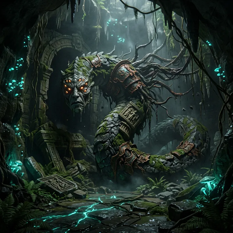 A massive, ancient creature that once was a human ruler, now grotesquely transformed into a monstrous beast. Its long serpentine body is covered in moss, cracks, and ancient stone-like scales, twisted and merged with remnants of ruined temples and decayed armor. The creature has multiple glowing eyes embedded across its head and torso, with tangled tendrils extending from its back like corrupted roots. The environment is a dark, humid underground abyss, glowing with bioluminescent spores and teal energy veins pulsing through the stone floor and walls. Its presence radiates immense sorrow and rage, as if cursed by betrayal. Show the creature partially coiled in the shadows, emerging from a collapsed shrine deep within a jungle sinkhole, exuding a sense of forgotten godhood.