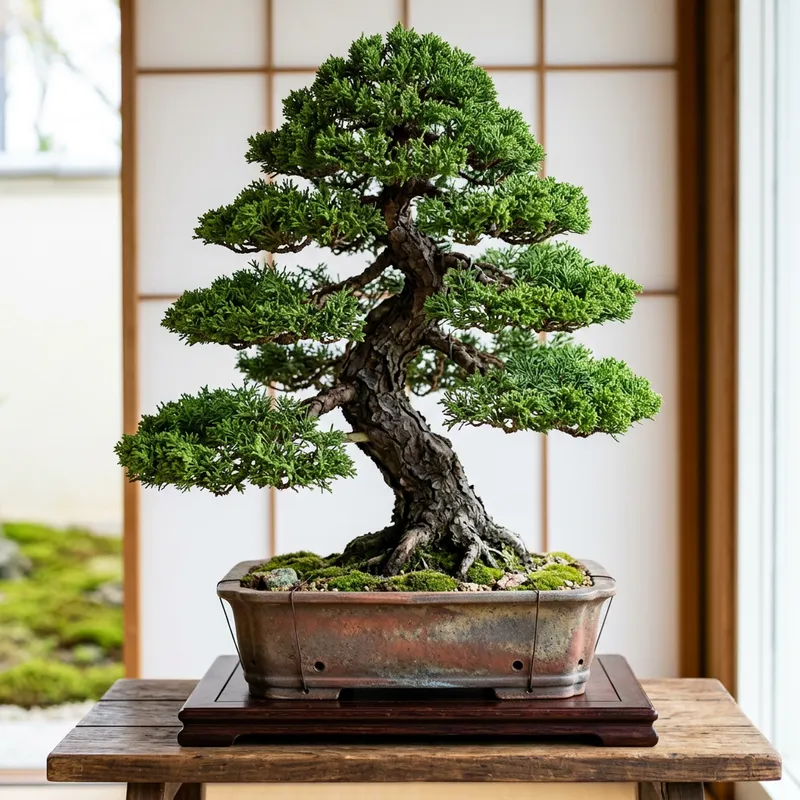 A mature bonsai tree with a thick, textured trunk and well-defined branches shaped in an informal upright style. The foliage is dense, compact, and neatly trimmed with small green leaves. The bonsai is planted in a traditional shallow bonsai pot with earthy tones. The background is simple and clean to highlight the bonsai tree as a guide for bonsai care and shaping.