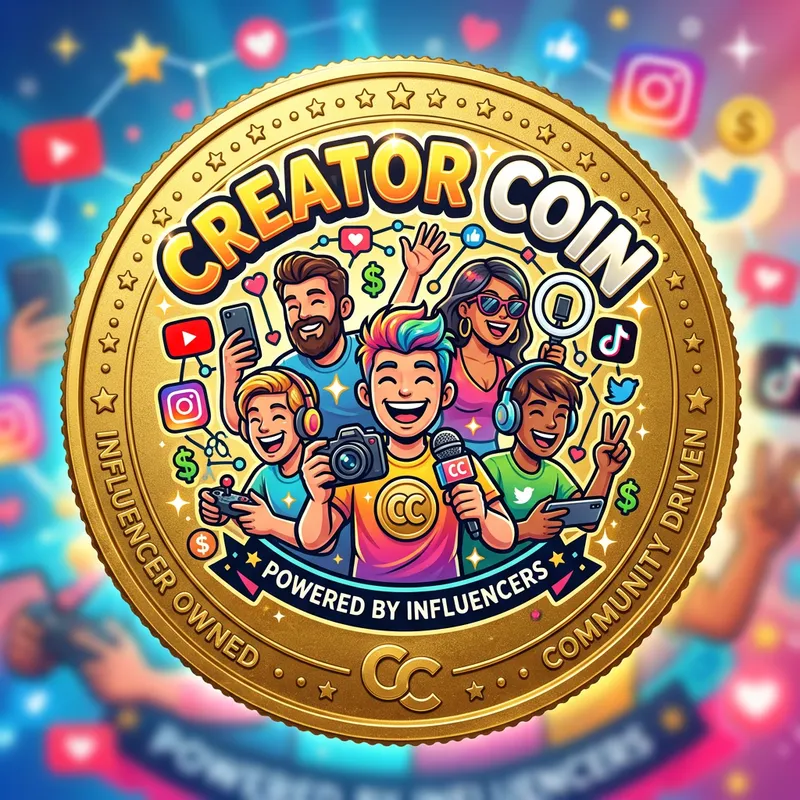 a memecoin logo for a coin called creator coin. it is a coin with a bunch of influnncers.