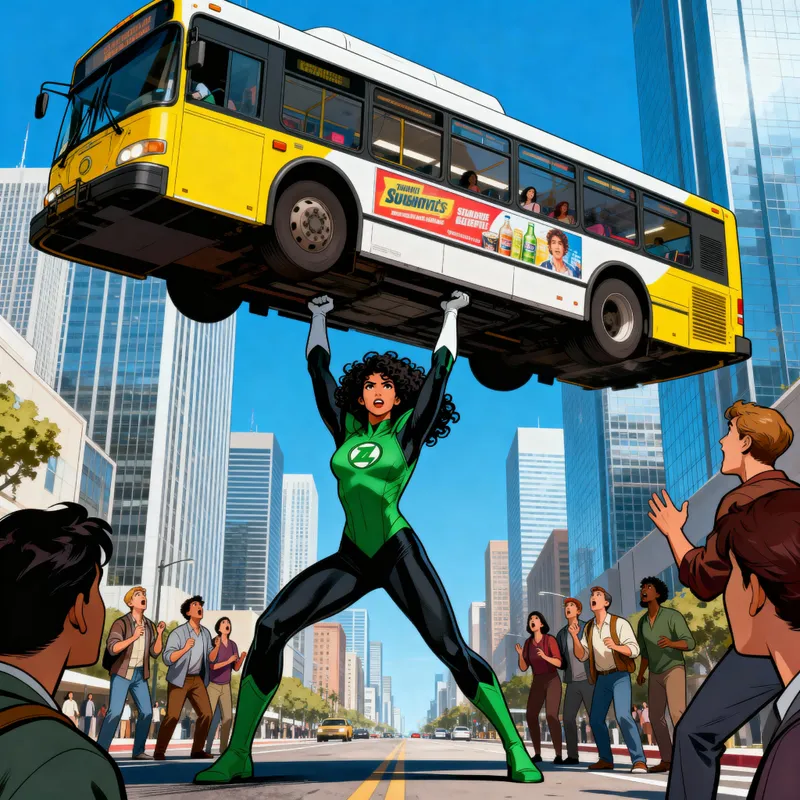 A Middle-Eastern female superhero with dark curly hair and a green costume, showcasing her incredible strength by lifting a full-sized city bus overhead. The setting is a bustling cityscape with people of different genders and descents expressing awe at the impressive feat. The bus is yellow and white with advertisements, and the road is lined with tall and modern skyscrapers under the bright blue sky.