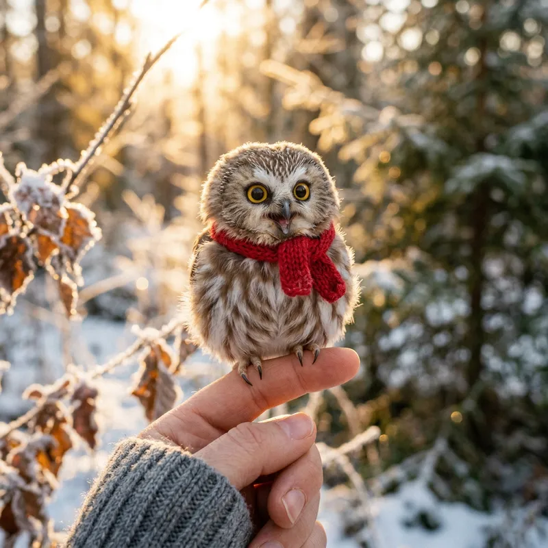 A minuscule baby owl, its fluffy down feathers in soft shades of brown and white, sitting on a fingertip. The owl wears a tiny red scarf, and its oversized golden eyes are wide with wonder. Its delicate talons lightly grip the finger, and its small beak opens slightly as if mid-hoot. The backdrop features a soft-focus woodland setting with golden sunlight streaming through frosted branches.