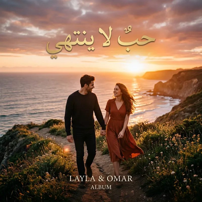 A modern and romantic music album cover featuring a couple holding hands at sunset, soft golden light, dreamy atmosphere, elegant typography in Arabic saying "حبٌ لا ينتهي", realistic style, high contrast, cinematic depth, suitable for Spotify or YouTube music