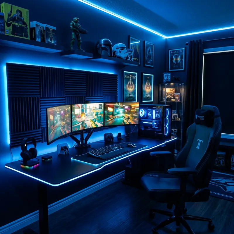 A modern gaming room with blue RGB lights, featuring a sleek gaming setup with multiple monitors, a high-end gaming chair, stylish gaming desk, and ambient blue LED lighting along the walls and under the desk. The room has a futuristic and immersive atmosphere with gaming accessories neatly arranged.