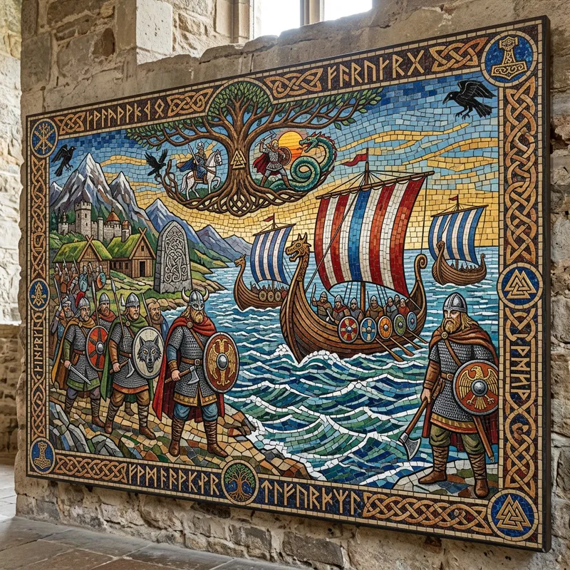 Vibrant Mosaic Artwork Depicting Viking Culture