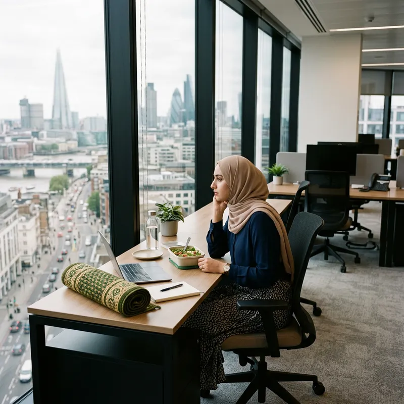A Muslim woman in a modern office, sitting alone at her desk during lunch, looking out at a city skyline. Her prayer mat is rolled up nearby. The mood is quiet, reflective, slightly lonely.