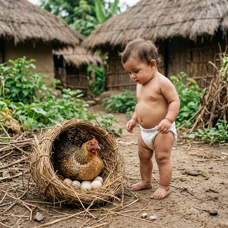 a natural DSLR photograph of a cute mini chubby baby wearing only a white diaper, standing on real dry village ground next to a handmade straw chicken nest, a real hen sitting at the entrance of the nest with several eggs visible under her, the baby watching with innocent curiosity, background shows only thatched huts (no modern houses) and green farm plants, captured in soft natural daylight with true-to-life colors, real skin texture, fine natural shadows, slight depth of field (subject in sharp focus, background softly blurred), looks like a real captured rural moment — not digital, not CGI, not 3D, not illustration, not painted, no artificial gloss, no watermark.