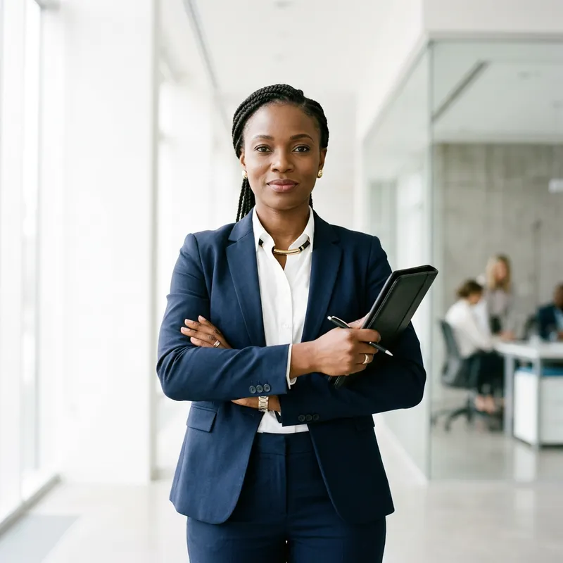 A Nigerian female confidently dressed in a business suit, her face revealing a determined expression. The depiction embodies clean lines and professionalism. The composition is lit with high-key lighting against a minimalist background, giving an impression reminiscent of a photograph taken with an 80mm lens on a high-quality medium format camera. The overall theme of the image is success.
