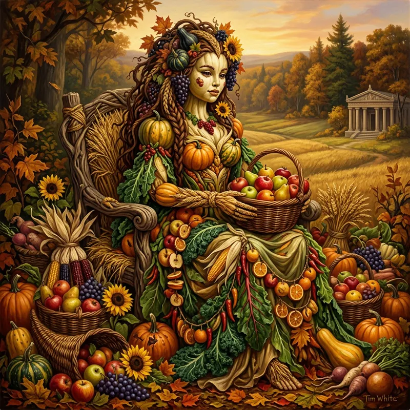 A painting of a curvy brunette woman surrounded by fruits and vegetables, an art painting, fantasy art, Venus goddess Athena, Tim White style, very beautiful masterpiece, made of food, pumpkin, apples, oranges, Mother Nature, Persephone sculpture, HD art, harvest.