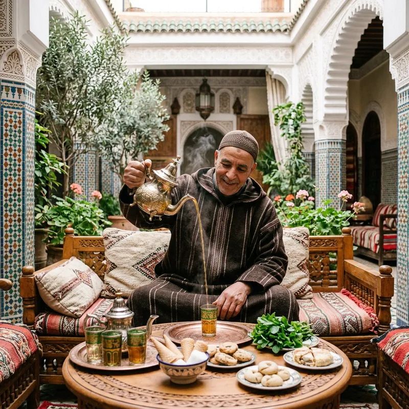 A person in traditional Moroccan djellaba sitting at a traditional Moroccan place with a dining table in front of them, pouring tea into a glass.