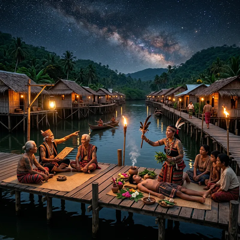 A picture for community Organization – A pre-colonial village with stilt houses, elders reading the stars, babaylan performing healing rituals.