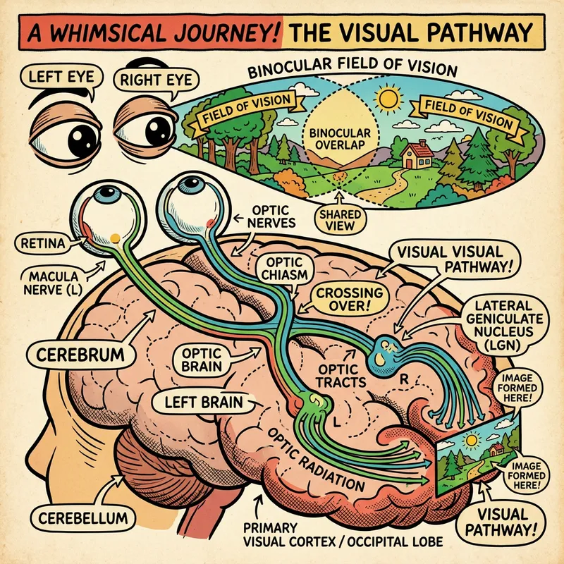 An imaginative cartoon interpretation of the visual pathway, featuring two distinctive eyes observing a singular binocular field of vision, all set with vibrant hues and bold lines. Suggested aesthetic follows the simplistic and direct style of early 20th-century comic strips rather than specific art movements or artists.